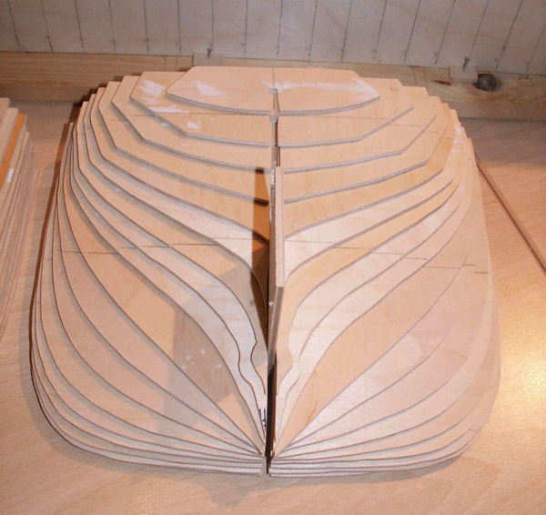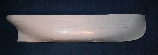 Die weitere Vorgehensweise: Beplankung mit 3mm Abachi-Leisten, spachteln, schleifen, spachteln ... die übliche Prozedur. Wenn der Rumpf glatt ist, werden die Plattengänge aufgebracht sowie die Profile der Rammschutzleisten etc. Dann wird von dem Urmodell in Glasfaserkunststoff ein Negativmodell angefertigt (zweiteilig) in das dann die Rumpf reinlaminiert wird - so können mehrere Rumpfabzüge vom Urmodell gezogen werden.