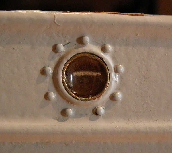 Außerdem wurden die Bullaugen in den Rumpf eingesetzt. Sie bestehen aus einem Messingring (Durchmesser 12mm, Breite 5mm) der von einer Reihe Nieten umgeben ist. In diesen Messingring wurde ein weiterer Messingring eingesetzt, der mit Epxoidharz ausgegossen wurde. Auf dem Foto sieht man leider noch ein paar Hilfslinien - da muss ich nochmal ein wenig Farbe nachtupfen (der Fussel oben ist nicht mit festlackiert - ich habe ihn erst nach dem Foto gesehen).