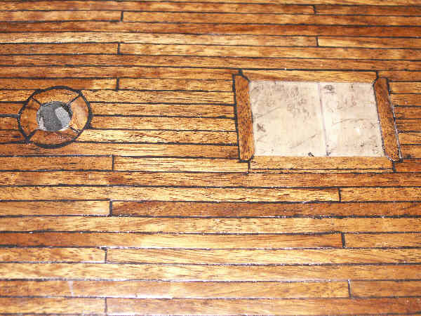 Zunächst wurde das Deck mit Decksplanken belegt und in der gewohnten Weise kalfatert (siehe Baubericht Nordbornholm etc.). Die Aussparungen für Niedergänge, Mast und Decksluken wurden freigelassen.