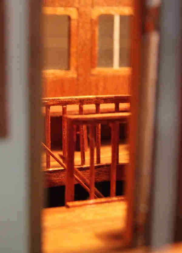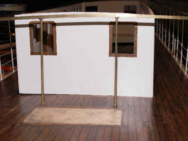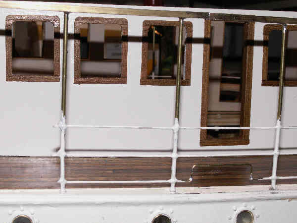 Außerdem habe ich bereits das Deckshaus (Salon, Speisesaal und div.Räume) fertiggestellt (3mm Sperrholz) - das wird dann fest auf dem Deck montiert. Im Augenblick ist es aber für die Montage der Fenster/Fensterdichtungen und der Innenausstattung noch lose. Die Fensterrahmen sind aus 0,6mm Teakfurnierstreifen a 2mm Breite.