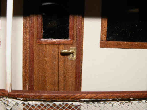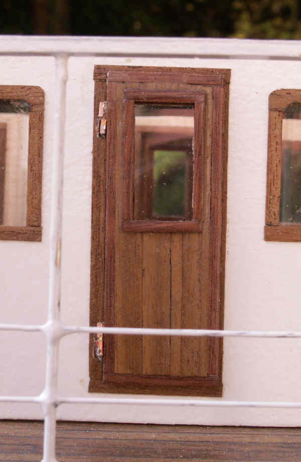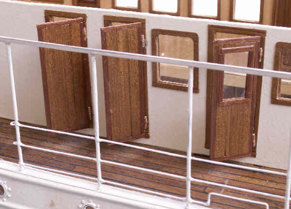 30.10.2009: wieder ein kleines Up-Date zum Modell. Inzwischen sind die Türen mit Ausnahme der Türgriffe und -schilde fertig (dreischichtig aufgebaut - innen 0,4mm Sperrholz, außen 0,6mm Teak- und Mahagonifurnier). Die Innenlage hat Aussparungen für die Scharnierstreifen. Die Scharniere werden noch in eisengraumetallic lackiert. Natürlich sind die Türen auch zum Öffnen vorgesehen und bekommen auch noch Feststeller an der Wand.