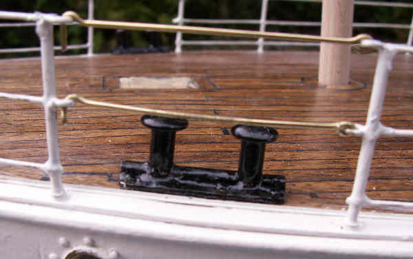 Die Poller sind eine Sonderanfertigung. Basis ist ein Messingröhrchen an das zu beiden Längseiten ein Messingflachprofil angelötet wurde. In das MS-Röhrchen wurden dann von oben die eigentlichen Poller (Kupferniete/Waschmaschine) eingepasst und mit reichlich Lötzinn oben abgerundet. Dann wurden alle Lötstellen versäubert und 6 Löcher in die Flachprofile gebohrt die die Befestigungsniete aufnehmen, die das Ganze am Deck fixieren. Davon brauchte ich 4 - die mittleren Poller sind kleiner und die habe ich noch nicht (gehören dorthin, wo der untere Durchzug einen kleinen Bogen nach oben macht).