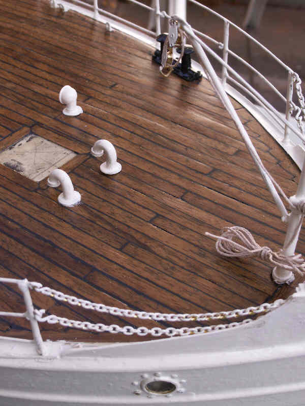 Auf dem Backdeck wurden etliche Kleinteile montiert: neben einem drehbaren Ankerkran sind dort jetzt 4 Lüfter und zwei Niedergänge, die Winkel für die Abspannung der Wanten die den Mast halten etc. Bei der Montage des Ankerkrans ist mir ein Fehler aufgefallen, der sich beim Bau eingeschlichen hatte. Das vordere Relingstück hat keine feste Verbindung zum Schanzkleid, sondern nur Ketten (sonst hätte man den Anker in echt nie über Bord bekommen). Es wird ein Draggenanker zum Einsatz kommen.