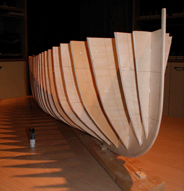Erste Stellprobe der Spanten am 30.01.2009 (zum Größenvergleich ein AA-Akku)