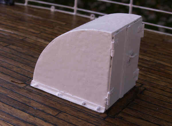 Im Augenblick tüftel ich gerade an den Decksaufbauten vorne: Niedergänge, Decksluke, Trossenkörbe, Lüfter, Ankerkran etc. Nach dem Gefummels mit den Holzfensterrahmen brauche ich mal wieder etwas anderes.
