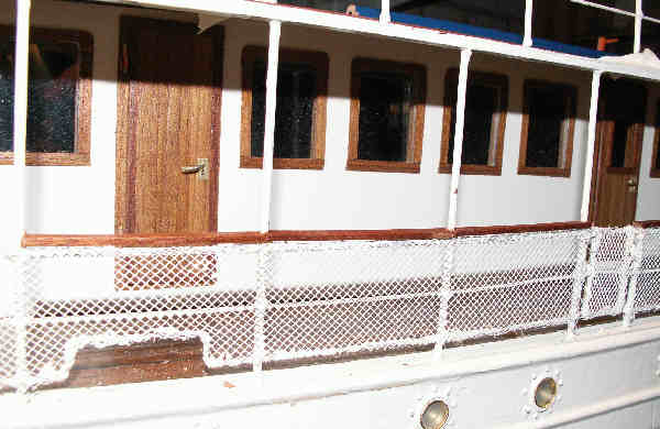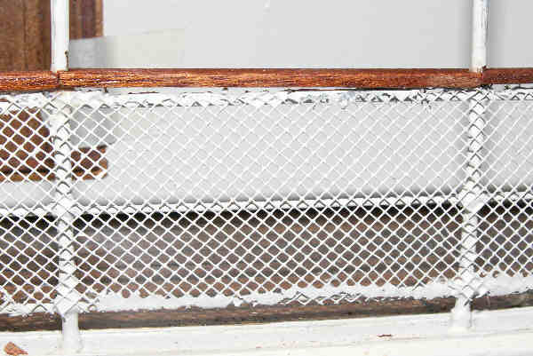 Viel Zeit und Mühe hat die Bespannung der Reling des Hauptdecks gemacht. Im Original waren geknüpfte Netze zwischen den Relingsdurchzügen gespannt um zu Verhindern, dass kleine Kinder oder Gegenstände über Bord gehen konnten. Nach ein paar Versuchen mit Garn und Draht so etwas zu knüpfen und einer provisorischen Einpassung eines Alu-Streckmetall-Gitters habe ich im Baumarkt ein relativ feinmaschiges Drahtnetz gefunden. Dies wurde mit etwas Übermaß zugeschnitten, um den oberen und unteres Durchzug gebogen und mit Kleber fixiert. Anschließend noch weiß lackiert und zum Abschluß oben drauf der Holzhandlauf (die Abschnitte sind immer genau zwischen den Relingstützen eingeklemmt).
