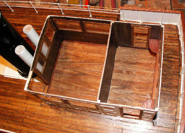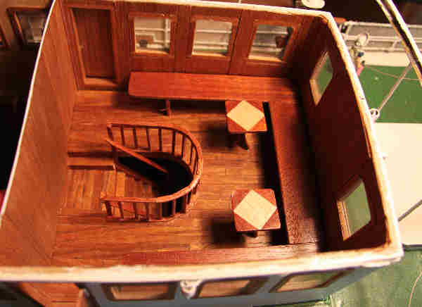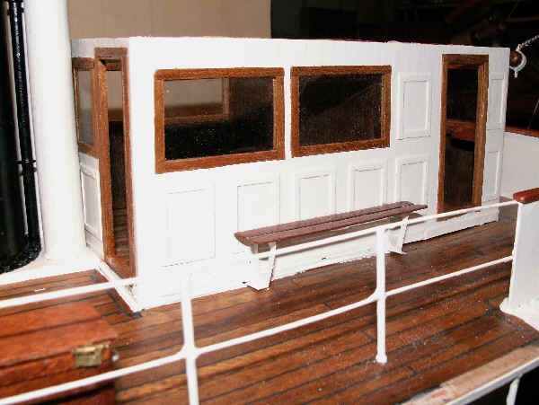Kommandobrücke und Rauchsalon sind aus 1mm Sperrholz aufgebaut, die Wände wurden innen mit Eichenfurnier verkleidet, für den Boden und die Fensterrahmen/Türrahmen wurde wieder Teak verwandt. Der Innenausbau wie z.B. zwei Schränke und eine Sitzbank in der Kommandobrücke wird aus Mahagoni gemacht.
