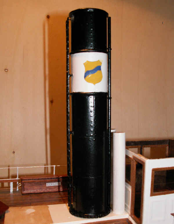 Zum Aufbau des Schornsteins diente mir eine Küchenpapierrolle die ich als Kern für dünnes Sperrholz genommen habe. Die Plattenstruktur wurde später in die Zylinderform eingefräst und die Vernietung mit kleinen Farbtropfen simuliert. (PS: ich habe auf alten Fotos später festgestellt, das Lüfter und Schornstein unter dem Persenningdach weiß gestrichen waren)