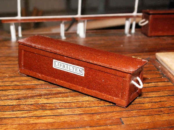 Für das Bootsdeck habe ich ein paar Mahagonikisten gefertigt für die obligatorischen Schwimmwesten. Alle Kisten kann man öffnen (Scharniere auf der Rückseite) - eine Kiste will ich eigentlich auch noch mit ein paar Schwimmwesten bestücken. Ich habe die aber jetzt auf dem Deck fixiert, da ich befürchte das ich sonst beim Betrieb diese einbüßen würde. (Höhe der Kiste 17mm, Länge 80mm).