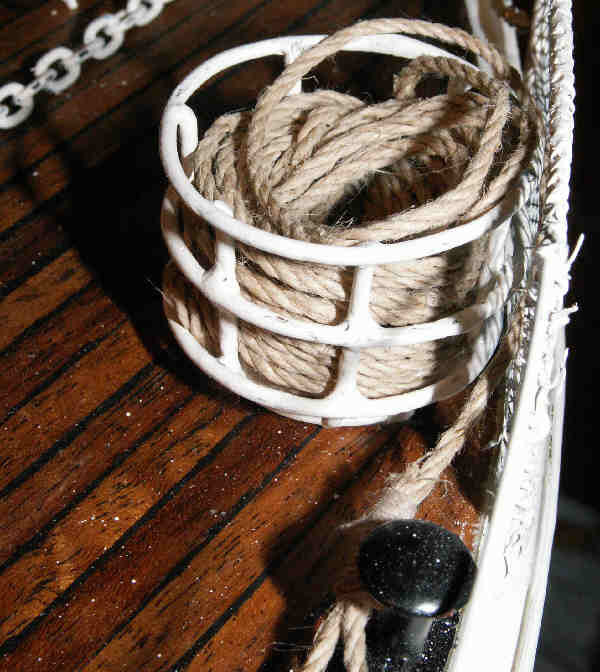 26.02.2010: Am meisten Spass machen ja meist die Kleinigkeiten. Auf dem Vorschiff standen beim Original in der Nähe der Pollen Trossenkörbe, die die Festmacherleinen aufnahmen. Für die Nachbildung habe ich 1mm Messingstab über einem Rundstab gebogen, zu Ringen verlötet, dann die senkrechten Streben angelötet und alles versäubert. Eine passende Trosse wurde dann gleich eingerollt.
