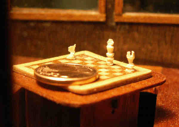 Als kleinen Gag habe ich für den Tisch ein Schachbrett konstruiert für das ich Mahagoni und Ahornfurnier verwendet habe. Die Figuren sind aus Zahnstochern rausgefräst und es werden natürlich noch mehr (ein Zahnstocher reicht für 6-7 größere Figuren oder etwa 10 Bauern). Für den Größenvergleich habe ich mal ein 1cent-Stück auf das Schachbrett gelegt.