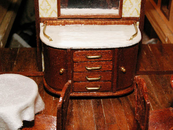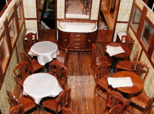 Am Spannendsten war die Ausgestaltung des Restaurants und da habe ich auch die meiste Zeit dran getüftelt. Die Wände hatten eine Textilbespannung in Mahagonirahmen - glücklicherweise bin ich im Besitz eines Fotos der Textiltapete. Das Muster habe ich nun am Computer mehrfach aneinandergesetzt und anschließend auf das richtige Maß verkleinert am Laserdrucker auf Etikettenpapier ausgedruckt und aufgeklebt. Anschließend wurden die Mahagonirahmen aufgebracht und alles klar lackiert.