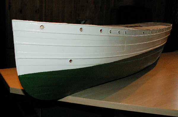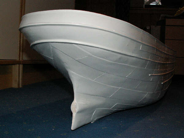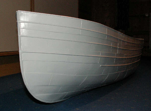Der lackierte Rumpf - leider ist das Foto etwas dunkel geraten - der Unterwasserrumpf ist grün.