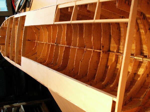 Nach Scannen der Spanten und Kontrolle der Maße nach dem Ausdruck konnte ich mit den Holzarbeiten beginnen. Die Spanten wurden aus 4mm Sperrholz gesägt.